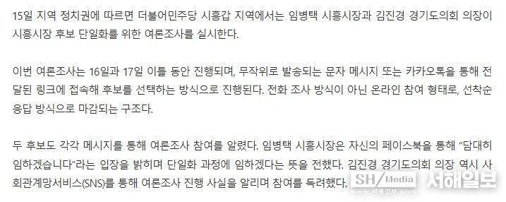 최근 민주당 시흥(갑) 기반의 시장 후보 단일화를 위해 시행된 여론조사가 카카오뱅크 등 리워드 앱을 통한 금전 살포에 더해, 특정 후보를 철저히 배제하기 위해 기획된 듯한 ‘표적형 설계’ 정황이 속속 드러나고 있어 지역 정가에 커다란 충격을 주고 있다.