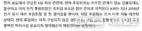 위의 기사 내용을 보면 “현재 후원회장과는 아무런 관계가 없는 인물인데 왜 현직인 것처럼 보도하고 자동 해산 됐다며 명백한 허위사실 공표이자 명예훼손에 해당한다는 입장” 이라고 보도했다.