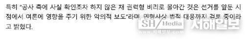 위의 기사 제목에 따르면 시흥도시공사가 서해일보에 대해 공직선거법 위반 등으로 법적 대응을 하겠다고 했는데 어떤 기사가 공직선거법을 위반했는지 그 근거를 밝혀야 한다.