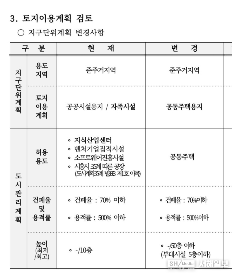 해당 부지는 원래 ▲지식산업센터 ▲벤처시설 ▲소프트웨어진흥시설 ▲시흥시 조례에 따른 공장만 들어설 수 있는 '자족시설용지(10층 이하)'다.